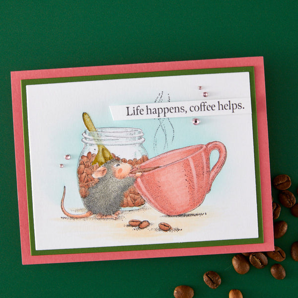 Brew-tiful Day Cling Rubber Stamp Set is part of the House-Mouse Heart and Soul Collection. Amanda is taking a big sip of freshly brewed coffee to start her day! In addition to the focal point image, the set of four stamps includes three sentiments: Have a brew-tiful day!, Thanks a latte for being you!, and Life happens coffee helps. Designed to be used with a stamp acrylic block.