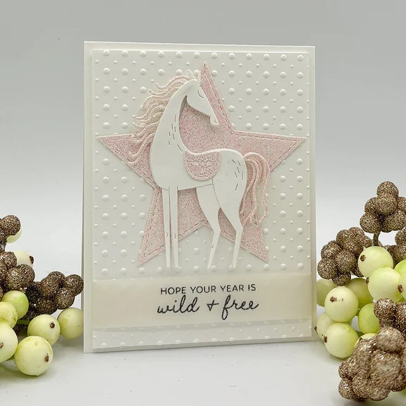 Good Fortune Horse Clear Stamp & Die Set assembles a wonderful and detailed horse with the nine thin metal cutting dies. The finished horse measures 2.70 x 3.70 in./6.80 x 9.30 cm. The four clear sentiment stamps are Charge into new adventures with bold spirit!, Hope your year is wild + free, Cheers to a strong and spirited new year, and Sending you endless joy and good fortune. What a fabulous way to celebrate 2026 and beyond!