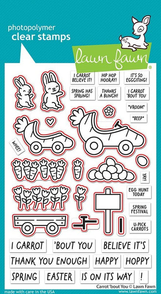 These cute cottontails are speeding on their way to the carrot patch! Hitch the carrot cars to a wagon filled with Easter eggs, a bounty of carrots, or a bouquet of tulips. The punny little sentiments in this set fit inside the sign for a cute way to customize your card. For more cute sentiments (and a super fun banner) combine this set with Carrot ‘bout You Banner Add-On!