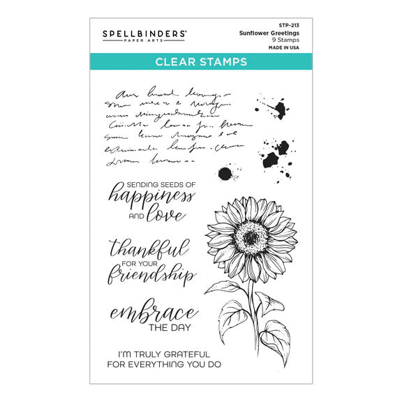 Sunflower Greetings Clear Stamp Set is part of the Serenade of Autumn Collection and has nine clear stamps. The focal image is a sweet sunflower bloom, along with four greetings, three ink blot designs and a script background. This set goes well with the rest of the items in this collection! They are designed to work with an acrylic block and made in the USA.