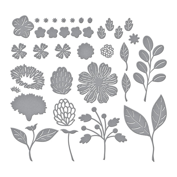 Vivid Blooms Etched Dies are from the Vivid Expressions Collection. This set of 17 thin metal cutting dies cuts a wonderful array of beautiful florals. Use them individually to create lovely accents or make an amazing bouquet. The finished Vivid Blooms Bouquet pictured in package measures 4.05 x 5.04 in./10.30 x 12.80 cm.