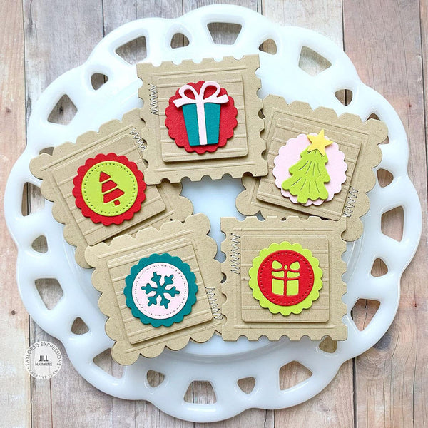 Create adorable miniature cards to top off gift bags, presents, and more with the Teeny Cards Die Set! This set die cuts a perfectly sized base for tiny cards, complete with a center score line for easy folding. Choose between two fun shapes—scalloped and postage stamp—and layer with the two smaller squares for added dimension. Plus, you can embellish your teeny cards with festive elements like a present box, bow, evergreen tree, and star topper, making them perfect for holiday gifting or any special occasion!