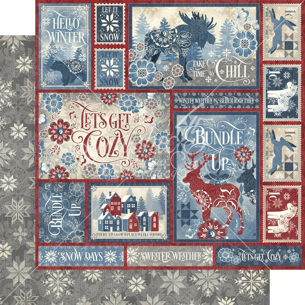 Let’s Get Cozy is the perfect collection to celebrate the winter season all bundled up in your favorite sweater.  The nordic patterns in classic blues and reds pull together this snowy Graphic 45 collection.  Fun sentiments like “There’s Snow Place Like Home” are perfect for embellishing your winter papercrafting projects.