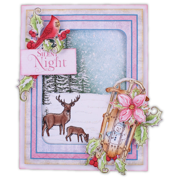 Remind friends and loved ones of the magic of the holidays with an adorable indoor Christmas tree window scene delicately decorated with holly berries, cardinals and mini poinsettias clustered around a snowy window pane, or choose to send joyful wishes with a stunning woodland church scene beautifully adorned with festive decorative die cuts and Christmas greens, or celebrate tranquil silent nights with breathtaking imagery of the snowy outdoors featuring tall pines, softly falling snow, beautiful wildlife and a child’s old fashioned sled! With just a touch of flower shaping, a hint of ink, a sprinkling of glitter and the help of the easy to follow instructions, your Winter’s Eve Christmas greetings will come together quickly and be completed long before the busyness of the season!