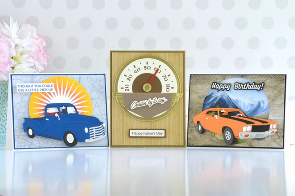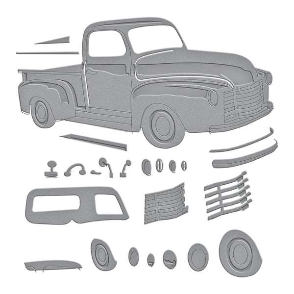 Timeless Truck Etched Dies are from the Classic Road Legends Collection by Mindy Eggen. Assembled, this set of 14 thin metal cutting dies brings this iconic pickup truck to life! It transports you to simpler times and evokes memories of fun road trip seven going down the street is an adventure! The finished truck measures approximately 4.70 x 2.47 in./11.90 x 6.30 cm. Cruise into some nostalgic vibes with the Classic Road Legends Collection by Mindy Eggen! Her debut collection with Spellbinders is perfect for classic car fans and those hard to create masculine projects.