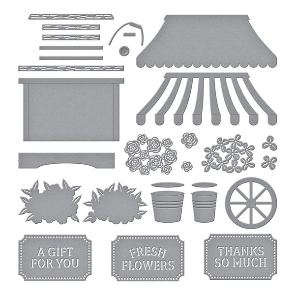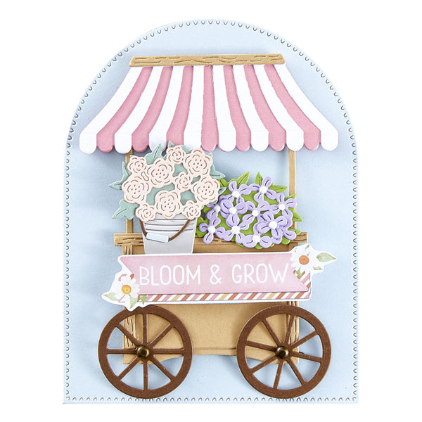 Flower Cart Etched Dies are part of the Simple Vintage Flower Shoppe Collection designed in collaboration with Simple Stories. Don't be fooled by the impressiveness of this beautiful die set- it's deceptively easy to put together! This charming striped cart and its bunches of flowers layer up perfectly for a complex look created with just a few pieces. When assembled, this set of 20 thin metal cutting dies creates a stunning and detailed roofed flower cart complete with bouquets, flower buckets and more! Also included are three sentiments: Fresh Flowers, A Gift for You, and Thanks So Much that can be placed on the cart’s front panel. The finished flower cart measures approximately 3.65 x 4.90 in./9.30 x 12.40 cm and the flower bucket measures 1.40 x 1.65 in./3.50 x 4.10 cm.